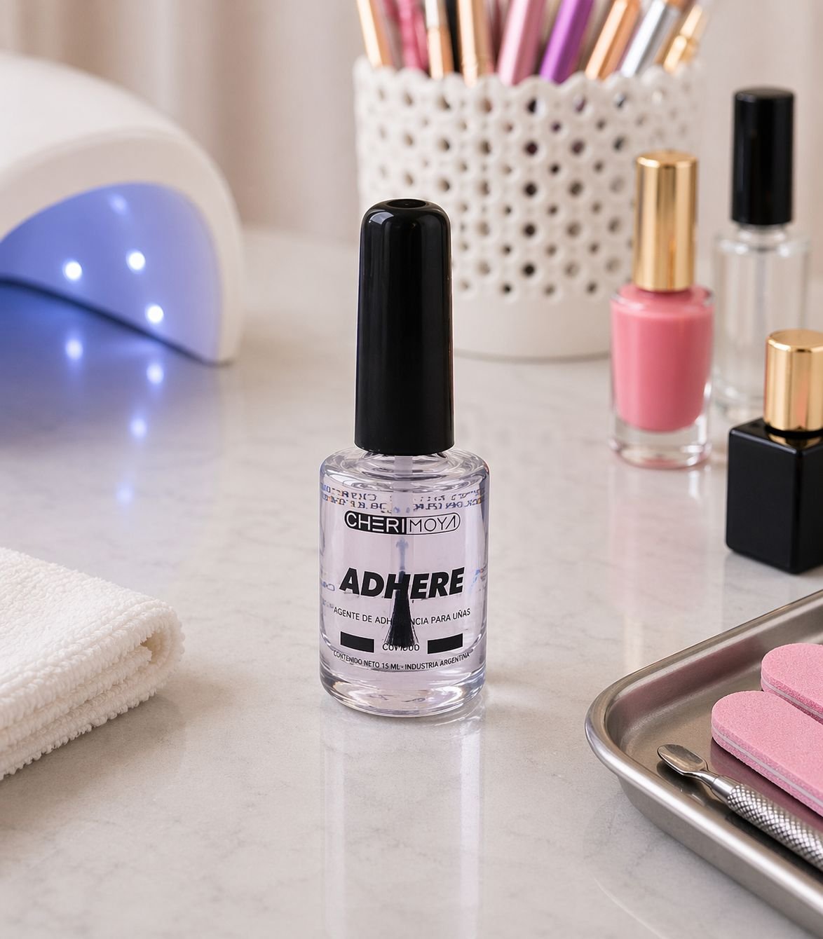 Adhere X10ml Cherimoya — adhesivo especial para mejorar la adherencia del gel sobre la uña natural. 💅